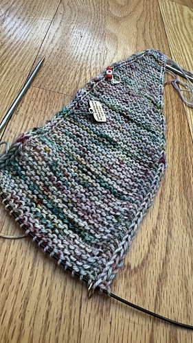 World of Difference is a 5-colored shawl worked sideways. You begin on the right tip with an interesting garter-tab cast on with a mock i-cord edging and increase until you get to the center panel where triangles are worked with short rows. From there you’ll decrease for the left side of the shawl. Best of all, the design is all done in garter stitches and the colors change just often enough to keep you from getting bored!